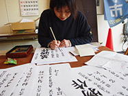 萬物作りは半紙に願い事を書き、神棚などに供え、一年の幸運を願う行事。「五穀豊穣」「金運向上」「事業繁栄」など、四字熟語で願いごとを書き記した紙に、組合員が来場者の名前を墨と筆で一枚一枚したため、手渡した。200枚以上が用意され、地元の商店や公共施設、得意先などにも配られた。 |
