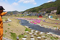大町市白塩町の河川公園でシバザクラの花が咲き始めた。濃淡のピンクや白などの花が川べりを染め、里山に春を運んでいる。