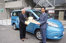日産自動車(本社横浜市)が実施する「EV自動車をもっと身近にプロジェクト!電気自動車活用事例創発事業」の一環で、電気自動車(EV)「e-NV200」を3年間無償貸与する事業に小谷村が選ばれた。21日に村役場で貸与式が行われた。 |