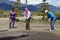 池田町マレットゴルフ連盟(中島睦会長)主催の第16回町長杯が4月29日、高瀬川河川敷のアルプス広場マレットゴルフ場で開かれた。各地から腕自慢約120人が参加。36ホール、パー144のストロークプレーで競い快音を響かせた。