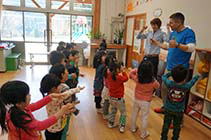 保育園では英語講師のウィリアムズ・スティーブさん、メリーアン・ガバーズさんが指導を担当。園児に英語の発音や基本的な表現に慣れ親しめるよう、 コミュニケーション能力の素地を養う英会話力アップをはかっている。 |