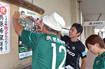 大町市のサッカーJ2松本山雅FC後援会大町支部(平林徳幸支部長)は7日、山雅カラーの緑色で街中を染めるプロジェクト「緑化作戦」を大町市の中央通り商店街で実施した。会員や元選手ら十数人が、店舗を1店ずつまわり、緑色を基調とした山雅ポスターを配布し掲示を求めた。