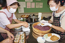 同村の食育ボランティアのメンバーが調理を担当した。メニューは村特産の紫米を使った「紫米いなり」や、マイタケの天ぷら、含め煮、和え物など。日ごろ高齢者が不足しがちな栄養素を補い、食欲をそそるよう心がけて作った。 |