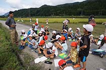 白馬村の白馬北小学校3年1組の児童31人がこのほど、白馬村のティーエムが耕作している飯森地区のしろうま農場の田んぼで、校外学習を行った。同農場を管理している津滝晃憲さんと、社員の月山潤さんから話を聞き、作物を作ることの大変さや楽しさについて理解を深めた。 |
