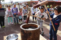 大町市社山下のどんぐり保育園(若林きみ子園長)はこのほど、同園玄関前の広場で餅つきを行った。12`の地元産もち米を4回にわけてつき、その日の給食で味わって秋の収穫の喜びを満喫した。