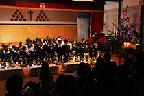 大町市の信濃キリスト教学園認定子ども園・大町幼稚園で16日、クリスマス会が行われた。園児たちが礼拝や歌、お遊戯などを発表し、クリスマスの喜びを分かち合った。 |