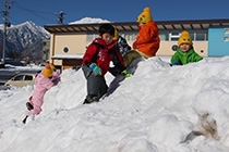 雪遊びを楽しむ子どもたちの歓声が響いている。大町市内の保育園や幼稚園では、園児たちが園庭に駆け出し、そり遊びなどを楽しんでいる。公園などで雪遊びを満喫する家族連れの姿もあった。 |