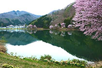 大町市内でも遅い時期に桜が楽しめる、大町市平中綱湖畔の桜が満開を迎えた。早朝や夕方には風がなぎやすく、水鏡の湖面に桜や山々が映え、カメラマンや観光客を楽しませている。