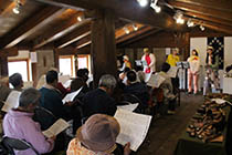 大町市堀六日町の麻倉で4月27日、第5回麻倉歌声喫茶が開かれた。40人ほどの参加者が、市内を中心に活躍する歌のグループ「ジョイフル」のリードで声を合わせ、春の歌など全27曲を響かせた。