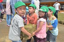 芝張りの共同作業は、地域に開かれた親しまれる園舎づくりの一環として同園が企画した。作業には、呼び掛けに集まった保護者や祖父母ら約50人が参加し、年少から年長の園児約90人とともに園庭周辺約700平方bに芝を張り付けていった。 |