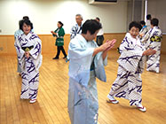 毎年両村で交互に開催され、ことしは開催地の松川村に伝わる正調安曇節を、唄と踊りの部門に分かれて練習した。保存会のメンバーが、踊りの一挙一動、唄の節回しなどを指導した。参加者らは「難しい」と感想を漏らしながらも、根気よく習得に励んでいた。 |