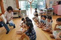 山国小谷に暮らす子どもたちにとって、あこがれを感じる「海」にちなんだ絵本を数多く紹介。手遊びやゲームも交え臨場感あふれる語り口で、子どもたちは本の世界での夏や海の世界を存分に堪能していた。 |