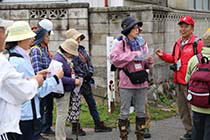 コースは安曇野市のJR大糸線安曇追分駅を出発し、池田町五丁目の北池田駅跡までを歩く全長約8`。町ガイドマスター会の会員たちが当時の車両や町なかの様子などを写真で紹介しながら、案内した。 |