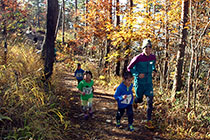 第1回鷹狩山トレイルランニング大会が3日、大町市鷹狩山山頂付近で初めて開かれた。大北地域から親子連れなどが参加。市内出身で世界で活躍するプロランナー・上田瑠偉選手を競技指導者に迎え、晴天に北アルプスを一望する紅葉の鷹狩山頂をかけっこ≠ナ満喫した。