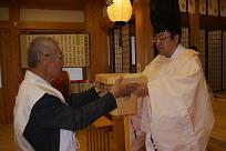 池田町の池田八幡神社で4日、来年のお札を配る年末恒例の神事「大麻頒布祭」が開かれた。住民の無病息災や家内安全などを願い、伊勢神宮と町内神社のお札合わせて4000体をお払いし、各神社の氏子総代に手渡した。 |