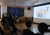 本年度は、県のICT事業で導入したタブレットも活用し、電子黒板を使ってプレゼンテーションした。「日本語と英語のことわざの違い」や「合金をつくってみよう」「リハビリとけがの対処」など、それぞれが興味をもった課題について取り組んできた実験や考察を披露した。発表を聞いた生徒や教諭からは多くの質問も出され、互いに理解を深め合った。 |