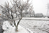 「春分の日」の21日、本州の南岸付近に停滞した前線の影響で、大北地方は降雪に見舞われた。大町市内は午前9時ころから気温が下がり、正午ころにはマイナス1・1度に。近づく春を前にした「寒の戻り」に、田畑や集落が久々に白く染まった。