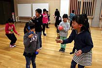 初日は約30人の小中学生が参加。皿に乗せた玉を落とさないようにぶつける「けん玉相撲」などのゲームを楽しんでウオーミングアップ。けん玉の技を磨こうと、小さい下級生に上級生が教えていた。 |