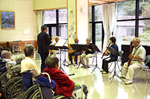 2部形式で、本格的なクラシックの名曲と、お年寄りが良く知っている昭和の名曲などを披露。お年寄りたちはクラシックの名曲にうっとりと耳を傾け、「ああ人生に涙あり」「喜びも悲しみも幾歳月」といった昭和の名曲は演奏に合わせて歌を口ずさんだり、手拍子を打ったりしてともに楽しんだ。 |