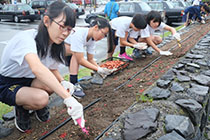 来年4月に大町市もサテライト会場となる第36回全国都市緑化信州フェア「信州花フェスタ2019〜北アルプスの贈りもの〜」を前に、仁科台中学校3年生はこのほど、チューリップの球根など花の定植をJR信濃大町駅前の花壇で行った。来春には真っ赤なチューリップの花が咲き、訪れる人を出迎える。 |