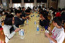 小谷小(松尾修校長、131人)では、学校給食用非常食のレトルトカレーと栄養補給用のようかん、ペットボトルの水が児童に配られた。子どもたちはパックの中にルーとごはんが入ったカレーを、災害時を想定し加熱せずに常温で、袋のままスプーンで食べた。 |