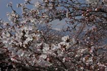 小谷村北小谷の菖蒲平一帯で、村指定の天然記念物・オクチョウジザクラが見頃を迎えた。他の桜に先がけて里山をピンク色に染め上げ、春らしい景色を見せてくれている。7日現在は五分咲きほど。ここ数日は暖かな日が続いたことから、満開も間近と思われる。 |