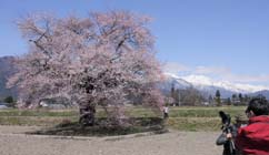 大町市常盤の「須沼の一本桜」が、見頃を迎えている。雄大な山々と田園風景をバックに薄桃色の花を咲かせ、県内外から観光客などが訪れている。22日ごろまで楽しめそうだ。