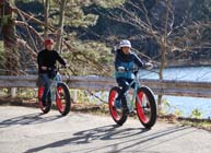 小中高生の居場所づくりや、若い世代に大町市の魅力を発信する活動を行う「まちのてらこや実行委員会」(小林秀徳代表)は22日、太いタイヤを備えた「ファットバイク」で市内を巡るイベントを開催した。小中学生など5人が参加し、木崎湖を1周。景色を堪能し、大町が誇る自然の豊かさに触れた。