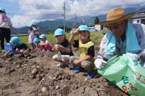 大町市常盤の清水農業生産組合(川上宗春組合長)の畑で5日、あすなろ保育園の年中・年長園児がジャガイモの収穫を体験した。組合員とともに種芋を植え付け、草取りをしながら成長を見守り、収穫を楽しみにしてきた。土から掘り出してもらったジャガイモを見つけ、「たくさんとれた」と笑顔で友達と見せ合った。