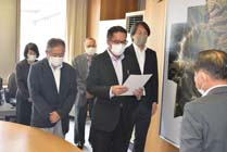 3蔵と同組合大町地区の代表者らは同日、市役所を訪れた。北安醸造の伊藤敬一郎社長は、3蔵の売り上げ平均がコロナ前に比べ3?4割落ち込んだことなど窮状を訴え、「自助努力にも限界がある。力を貸してもらいたい」と支援を求めた。 |