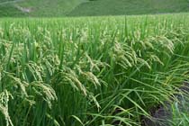 8月も終わりに近づき、白馬村内の水田でも稲穂が実をつけて、首を垂れはじめた。気温はまだ高く、夏の気配はあるものの、秋が着実に訪れている。 |