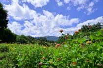 国営アルプスあづみの公園大町・松川地区は、れき原の花畑でジニアが見頃。好天に恵まれた28日、色とりどりの花が、まぶしい日差しに輝いていた。ジニアは和名ヒャクニチソウ(百日草)としても知られ、花期が長くガーデニングでも人気。れき原には約1万株が栽培され、花は10月上旬まで楽しめそう。 |