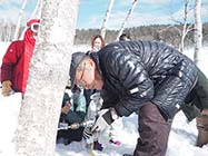 大町市のNPO法人ぐるったネットワーク大町は2月26日、「季節限定!白樺の樹液の体験会」を同市美麻の中山高原で開いた。親子連れなど12人が参加し、樹液について学び、早春限定の樹液を味わった。 |