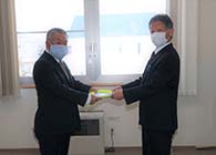 贈呈式は村社会福祉ふれあいセンターで行われ、平林豊教育長に手渡した。コロナ前は入学後に学校で配布していたが、新型コロナウイルスの感染状況を受け、村教委事務局へ寄贈し学校を通じて児童へ配布する。 |