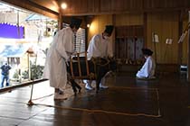大町市社宮本の国宝仁科神明宮で15日、県無形民俗文化財「古式作始めの神事」が行われた。祈年祭としごいのまつりに奉納する伝統の神事。地域住民らが見守る中、鍬くわはじめや種まきなど1年の耕作順を昔ながらの所作で再現し、稲作を中心とした農作物の豊作を願った。種もみを入れたおけを打ち付ける音で今年の稲作の豊凶を占う「もみ占い」では「早稲9部、中手7部、奥手8部」となり、松井秀吾宮司は「例年通りの豊作でしょう」と見通した。 |
