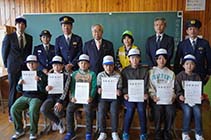 大町市の八坂小学校で12日、令和4年度「わが家のセーフティーリーダー」の委嘱式が行われた。大町警察署生活安全課の市川幸誠課長、荒井今朝一教育長、大町少年警察ボランティア協会員らが同校を訪れ、6年生8人に委嘱状とセーフティーリーダーの証しである帽子を手渡した。 |