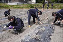 白馬村の白馬高校1年生44人が11日、同村北城の増井春美さん・恵子さん夫妻と若手農業者の佐藤栄太郎さんとともに、約30eの黒豆畑で種植えを体験した。黒豆の特産化を目指す作り手の熱い思いにふれながら、農業への関心を高めた。
