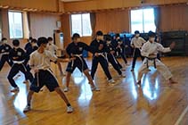 生徒は事前にビデオ学習を行い、松濤館流の基本の形について学んできた。体験授業ではビデオ学習で理解が難しかった動作などを、生徒の質問に応えながら分かりやすく伝えた。