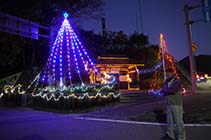 国道19号と県道舟場矢下線との交差点にある、大町市八坂の赤土ポケットパークで、恒例のイルミネーションの点灯が始まっている。金太郎伝説のある大姥山の麓のあずまや周辺が電飾で飾られ、色とりどりの明かりに包まれて幻想的な雰囲気を醸し出している。 |