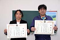 池田町会染内鎌で16日に発生した火災で、初期消火活動に協力し被害を最小限に食い止めたとして、北アルプス広域消防本部と南部消防署は29日、近くに住む内山幹之さん(46)と内川剛志さん(46)=いずれも自営業=の2人に消防協力者として感謝状を贈った。 |