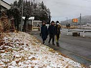 寒気の影響で強い冷え込みとなった2日、大町市北部、白馬村、小谷村の平地で初雪が降った。田畑やゲレンデは白く染まり、登校時間帯を迎えた小中学校の通学路では、児童や生徒が寒そうに手をこすりながら歩く様子や、楽しげに雪と戯れる姿も見られた。 |