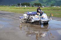 大町市常盤上一の専業農家・清水淳市さんが今年、水田に種もみを直接まく直播じかまき栽培で新たな米作りに取り組んでいる。5月24日は自身が所有する30eの水田で田植えが行われた。 |