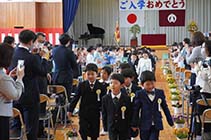 大町市の大町南小学校では、33人の新1年生が仲間入りした。1年生は上級生や教職員、来賓・保護者らの大きな拍手に迎えられて入場。少し緊張した面持ちで入学式に臨んだ。