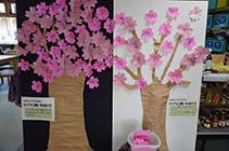サロンの参加者がピンクの折り紙で桜の花を作り、「健康に過ごせますように」「100歳まで頑張るぞ」など、花びらにメッセージを書いた。2本の木と折り紙を多数用意し、訪れる人にも願い事を書いた花を飾ってもらえるようにしたところ、日ごとに花数が増えている。 |