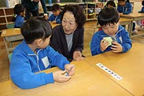ミニランドセルは約3aの大きさで、幅約1.5aのテープを切って接着剤で貼り付け、肩紐など細部まで本物を再現。大町南小学校では会員3人が2クラス4 0人に配り、児童が「かわいい」と笑顔をほころばせていた。 |