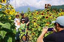 大町市内の有志でつくる「ひまわりを植えて大町を元気にする会」(宮脇哲子会長)は23日、初企画の写真撮影会とスケッチ会を開いた。内外から大勢が参加。クリーム色やオレンジ、赤黒、黄色など、個性的な花が咲くひまわり畑で、花の観賞を楽しみながら自分だけの写真や絵の作品に残した。ひまわりは後から追加で植えた分もあり、9月ごろまで楽しめる見込みという。