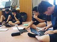 松川村と友好都市協定を結ぶ台湾彰化県鹿港(ルーカン)鎮との交流事業の一環で、11月に台湾を訪問する松川中学校2年生の希望者約60人を対象にした事前研修が進んでいる。27日は、鹿港中学校との交流に向けた準備をグループごとに行った。