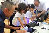 池田町の通所型サービス「寄りましょ会」の利用者と、こども家庭センター「にこまる」を利用する未就園児の親子を対象にした流しそうめんが27日、活動拠点である町総合福祉センター「やすらぎの郷」の中庭で開かれた。約30人が参加し、涼をとりながら心ゆくまで味わった。 |