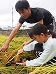 参加者らが手植えしたコシヒカリを刈った。鎌の使い方や縛り方を教わり、グループごとに協力して作業を進めた。刈り取った稲をそろえて束ね、わらで縛っていった。虫を観察したり稲の重みを感じながら、自然と戯れた。 |