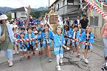 白馬村北城の切久保諏訪神社で15日、秋の例大祭が行われた。「ふりょ」と呼ばれるにぎやかな祭り行列が地域内を練り歩き、五穀豊ほう穣じょうや住民の平安などを願った。 |